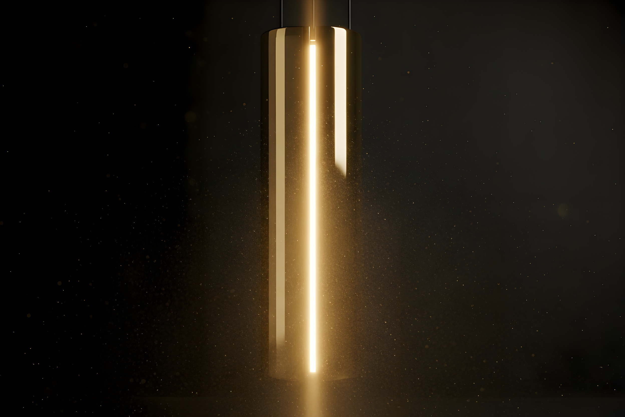 Een perfecte cilinder wordt met één drastische ingreep open geslepen. Die doorlopende gleuf is de kloof — het moment van keuze, verandering, de “leap”. In de kern plaatsen we de lichtmodule, zodat het licht omhoog en omlaag schijnt én door de kloof naar buiten treedt.